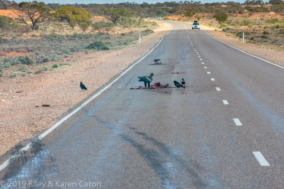 Lots and lots of roadkill with birds feeding. The large bird is a wedgetail eagle.