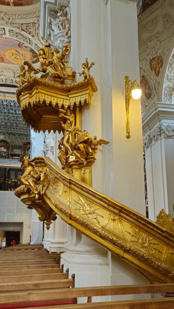 In the heart of Bavaria lies the charming city of Passau, an old but vibrant city that graces the banks of the Danube. Its medieval streets are woven with a rich Catholic tradition and a touch of Baroque splendor. The majestic St. Stephen’s Cathedral, a UNESCO World Heritage Site, has an ornate interior with a ceiling of vibrant frescos. It also boasts one of the largest pipe organs in the world. The organ area was under construction, so we were unable to see it in all its splendor.